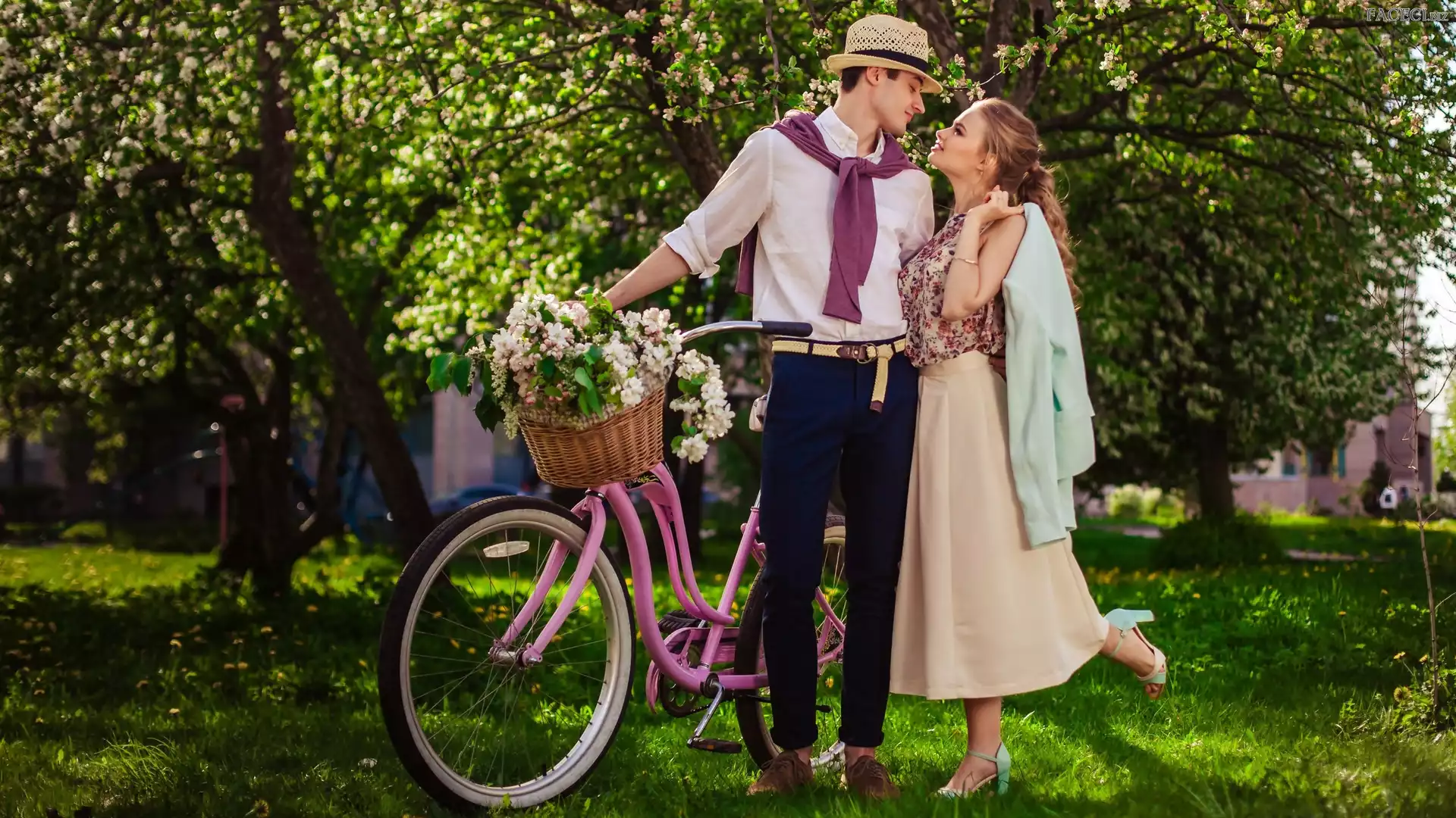 Rower, Kobieta, Wiosna, Ogród, Mężczyzna, Bukiet kwiatów - faceci.biz